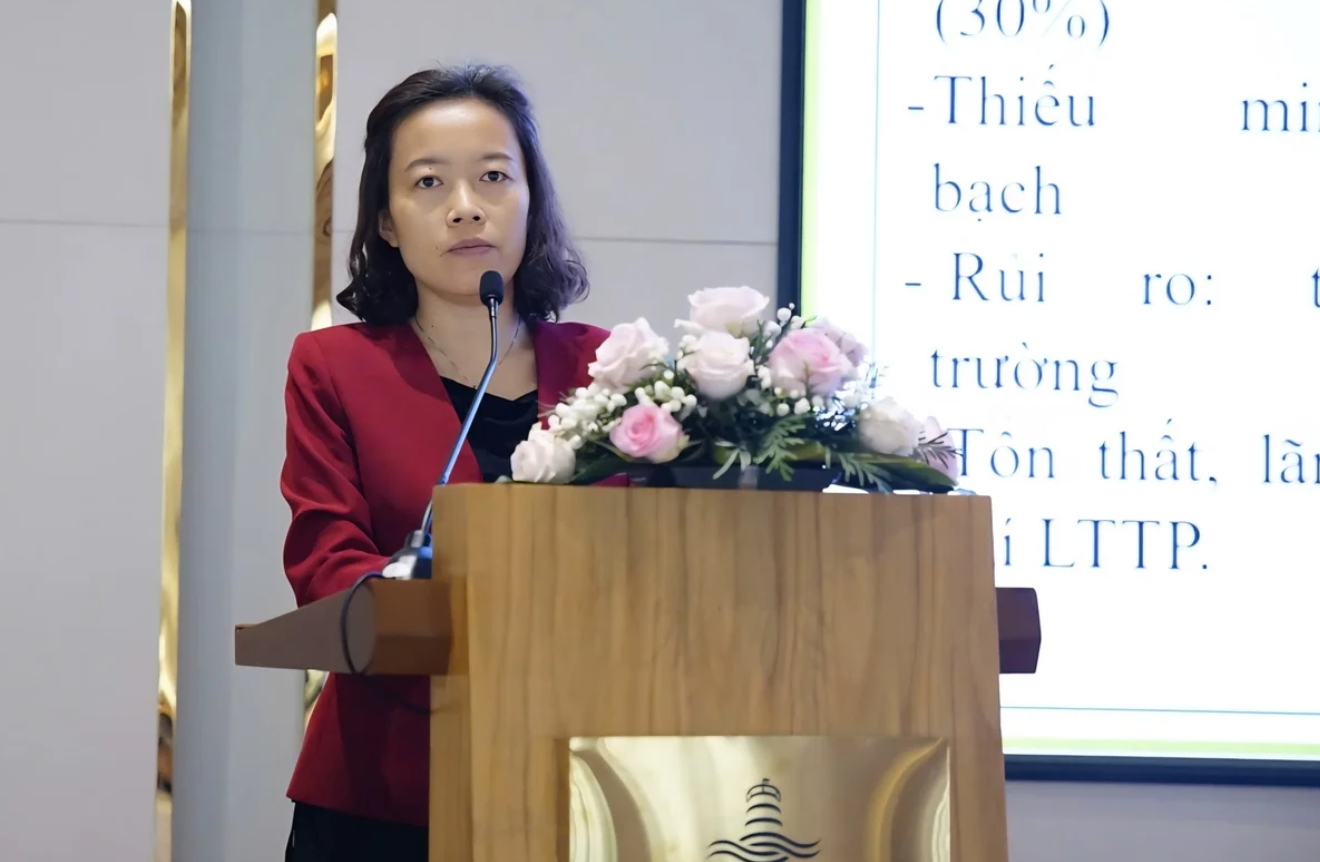 Truong Thu Trang shared her views at the workshop “Agricultural Insurance Linked to Risk Management for Agricultural Value Chains and Viet Nam’s Orientation for 2026-2030.” Photo: Linh Linh.
