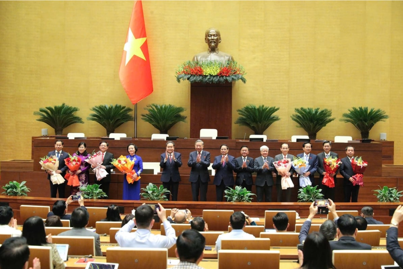 Leaders of the Party, the National Assembly, and the Government presented appointment decisions and offered flowers to the Deputy Prime Ministers and Ministers. Photo: Ho Long.On October 25, during the sixth working day of the 10th session of the 15th National Assembly, held at the National Assembly Building in Hanoi, the Assembly reviewed and decided on several personnel matters.